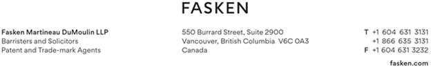 In connection with this opinion, we have examined and relied upon (a) the Registration Statement, (b) the prospectus constituting part of the Registration Statement, (c) the Company’s Certificate of Amalgamation, Certificate of Name Change, Notice of Articles and Articles, as currently in effect, and (d) originals or copies certified to our satisfaction of such records, documents, certificates, memoranda and other instruments as in our judgment are necessary or appropriate to enable us to render the opinion expressed below.