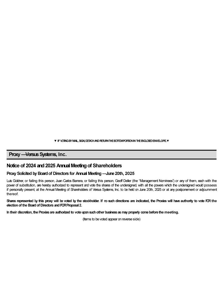 Proxy — Versus Systems, Inc. Notice of 2024 and 2025 Annual Meeting of Shareholders Proxy Solicited by Board of Directors for Annual Meeting — June 20th, 2025 Luis Goldner, or failing this person, Juan Carlos Barrera, or failing this person, Geoff Deller (the “Management Nominees”) or any of them, each with the power of substitution, are hereby authorized to represent and vote the shares of the undersigned, with all the powers which the undersigned would possess if personally present, at the Annual Meeting of Shareholders of Versus Systems, Inc . to be held on June 20 th, 2025 or at any postponement or adjournment thereof . Shares represented by this proxy will be voted by the stockholder . If no such directions are indicated, the Proxies will have authority to vote FOR the election of the Board of Directors and FOR Proposal 2 . In their discretion, the Proxies are authorized to vote upon such other business as may properly come before the meeting . (Items to be voted appear on reverse side) ხ IF VOTING BY MAIL, SIGN, DETACH AND RETURN THE BOTTOM PORTION IN THE ENCLOSED ENVELOPE. ხ